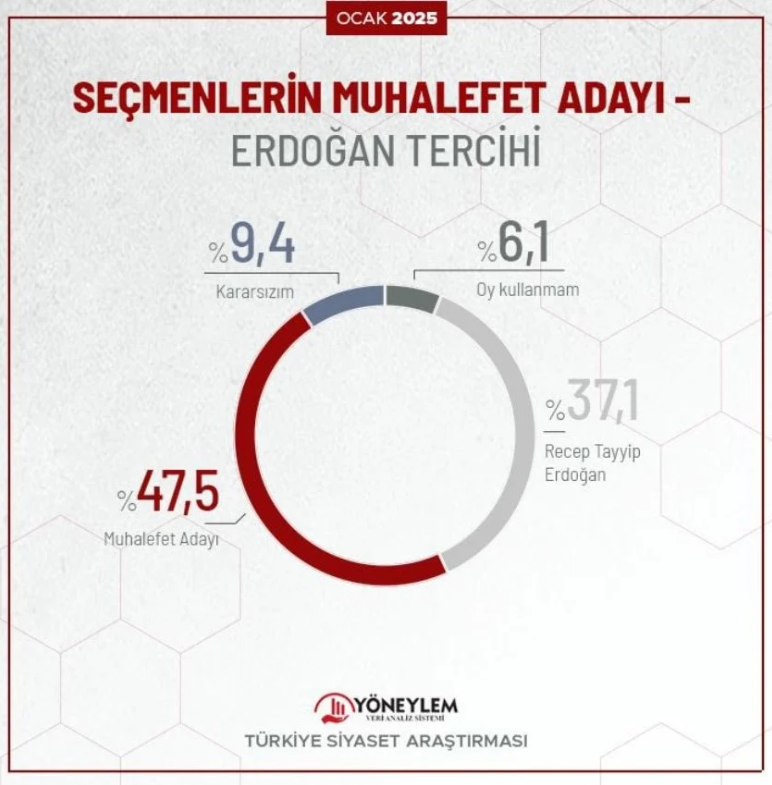 Anket sonuçlarında, Erdoğan diyenler yüzde 37,1 çıkarken, muhalefetin adayını desteklediğini ifade edenler ise yüzde 47,5 oldu.
