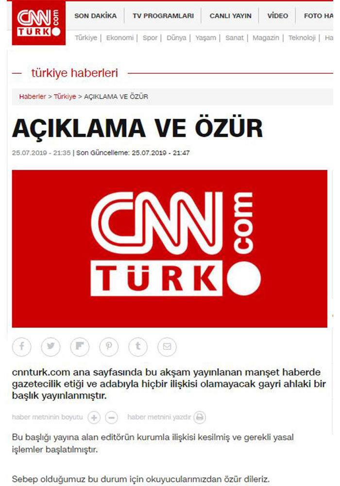 Yapılan açıklamada “cnnturk.com ana sayfasında bu akşam yayınlanan manşet haberde gazetecilik etiği ve adabıyla hiçbir ilişkisi olamayacak gayri ahlaki bir başlık yayınlanmıştır” denildi.