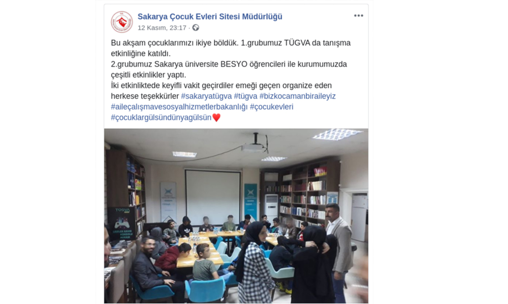 Sakarya Valiliği’ne bağlı Sakarya Çocuk Evleri Sitesi Müdürlüğü bünyesindeki Çocuk Evi’nde kalan çocuklar Türkiye Gençlik Vakfı’na (TÜGVA) götürüldü. Çocuklar, AKP’li Cumhurbaşkanı Recep Tayyip Erdoğan’ın oğlu Bilal Erdoğan’ın yöneticisi olduğu TÜGVA’nın tanışma etkinliğine katıldı. Birgün gazetesinden İsmail Arı'nın haberine göre Sakarya Çocuk Evleri Müdürlüğü’nün 12 Kasım’da yaptığı açıklamada “Bu akşam çocuklarımızı ikiye böldük. Birinci grubumuz Türkiye Gençlik Vakfı’nda (TÜGVA) tanışma etkinliğine katıldı” ifadeleri yer aldı.ÜLKÜ OCAKLARI’NA GÖTÜRDÜLER