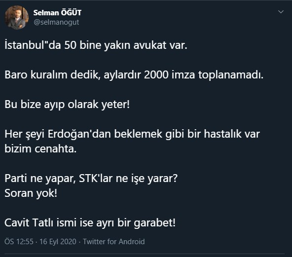 Twitter hesabından konuyla ilgili yaptığı paylaşımda, İstanbul'da 50 bine yakın avukat olmasına rağmen 2000 avukatın imzasına ulaşamadıklarını belirten Öğüt, tepkisini "Bu bize ayıp olarak yeter!" diyerek dile getirdi. Öğüt, yeni baronun kurucular kurulunda yer alan Hukukçular Derneği Başkanı Cavit Tatlı için de "garabet" ifadesini kullandı.