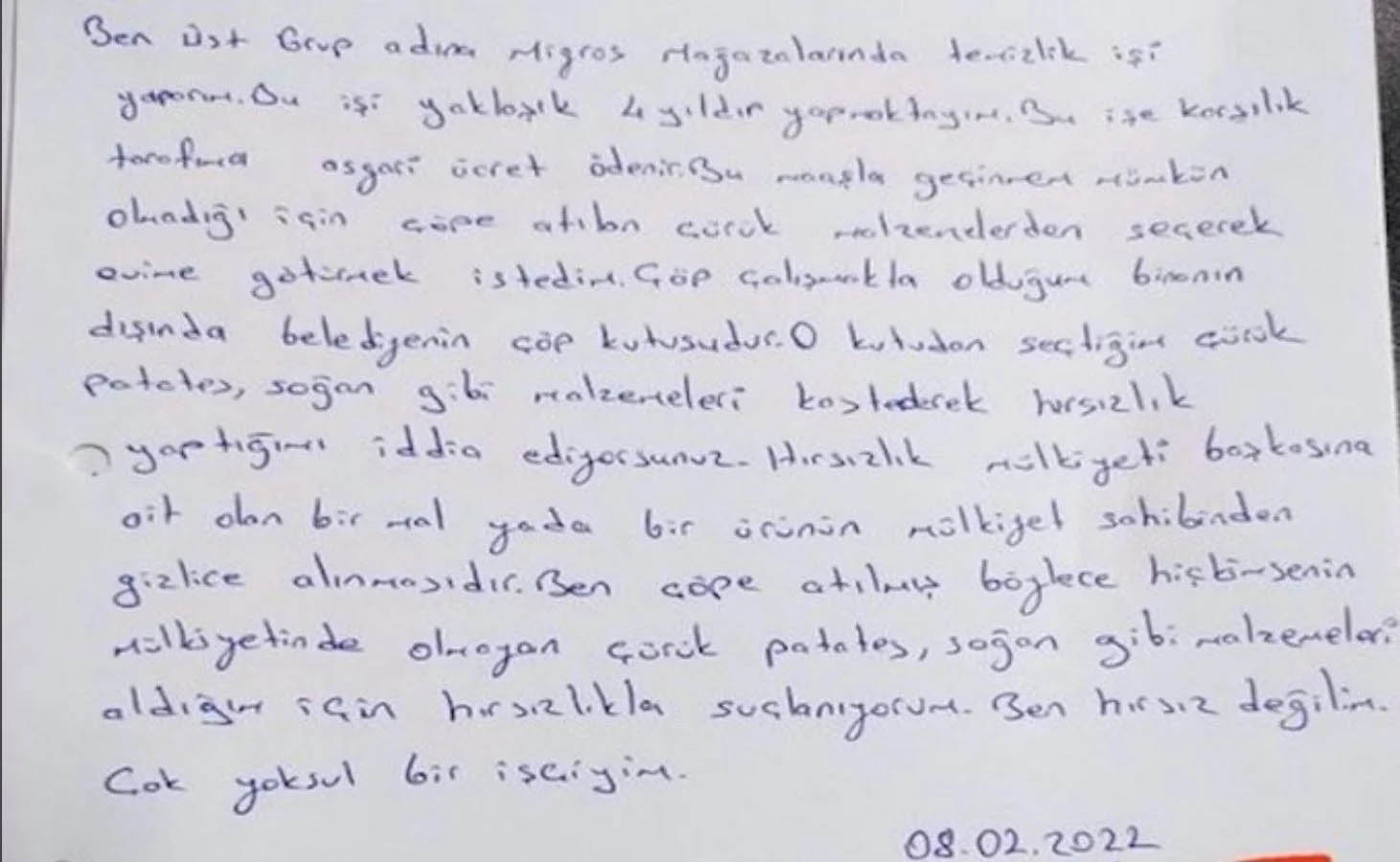 Migros'un Merter'deki bir şubesinde çalışan bir işçi, çöpe atılmak üzere ayrılan çürük sebzelerden alınca işveren tarafından hırsızlık suçlamasıyla işten atıldı. İşçinin yazdığı savunmada, “Hırsız değilim. Çok yoksul bir işçiyim” ifadeleri yer aldı.