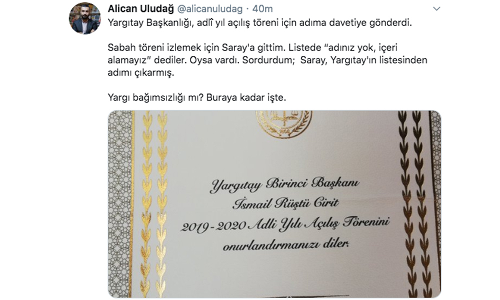 Cumhuriyet gazetesi yargı muhabiri Alican Uludağ, Yargıtay tarafından Adli Yıl Açılış Töreni'ne davet edildi. Törene katılmak için Saray'a giden Uludağ, "Listede 'adınız yok, içeri alamayız" denilerek törene alınmadı. Uludağ Twitter'dan yaptığı paylaşımda, "Yargıtay Başkanlığı, adlî yıl açılış töreni için adıma davetiye gönderdi. Sabah töreni izlemek için Saray'a gittim. Listede 'adınız yok, içeri alamayız' dediler. Oysa vardı. Sordurdum; Saray, Yargıtay'ın listesinden adımı çıkarmış. Yargı bağımsızlığı mı? Buraya kadar işte" ifadelerini kullandı.
