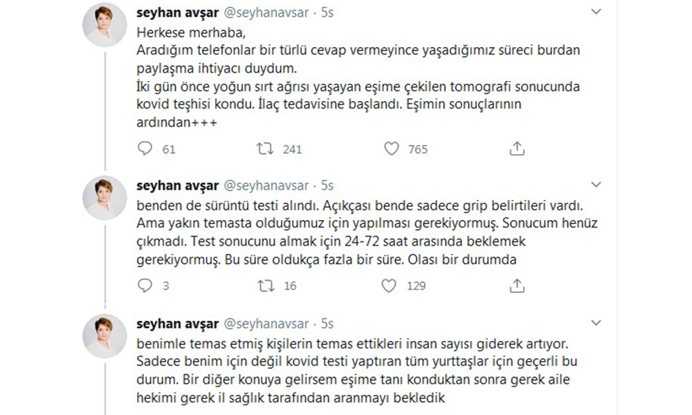 Cumhuriyet Gazetesi'nin başarılı muhabiri Seyhan Avşar koronavirüs testisinin pozitif çıktığını açıkladı. Avşar'ın sağlık durumunu ilişkin yaptığı açıklama şöyle: "Maalesef benim test sonucum pozitif çıktı. Paylaşımım üzerine Sağlık Bakanlığı yetkilileri tarafından arandım. Testlerin daha erken sonuçlanması ve 184 hattındaki sorunu gidermek için çalışmaların yapıldığı belirtildi. İlaçlarımda bugün tarafıma teslim edildi."Seyhan Avşar eşinin testinin pozitif çıkmasının ardından Sağlık Bakanlığı'nın kurduğu SABİM 184'i defalarca aradığını belirterek sosyal medya hesabından şu sözlerle tepki göstermişti: Herkese merhaba, Aradığım telefonlar bir türlü cevap vermeyince yaşadığımız süreci burdan paylaşma ihtiyacı duydum. İki gün önce yoğun sırt ağrısı yaşayan eşime çekilen tomografi sonucunda kovid teşhisi kondu. İlaç tedavisine başlandı. Eşimin sonuçlarının ardından benden de sürüntü testi alındı. Açıkçası bende sadece grip belirtileri vardı. Ama yakın temasta olduğumuz için yapılması gerekiyormuş. Sonucum henüz çıkmadı. Test sonucunu almak için 24-72 saat arasında beklemek gerekiyormuş. Bu süre oldukça fazla bir süre. Olası bir durumda benimle temas etmiş kişilerin temas ettikleri insan sayısı giderek artıyor. Sadece benim için değil kovid testi yaptıran tüm yurttaşlar için geçerli bu durum.Maalesef benim test sonucum pozitif çıktı. Paylaşımım üzerine Sağlık Bakanlığı yetkilileri tarafından arandım. Testlerin daha erken sonuçlanması ve 184 hattındaki sorunu gidermek için çalışmaların yapıldığı belirtildi. İlaçlarımda bugün tarafıma teslim edildi. https://t.co/yJTOV349TQ