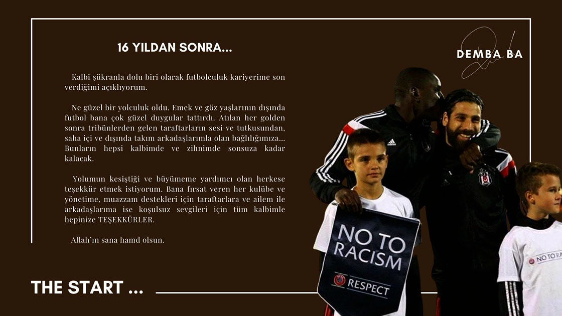 Ayrılık kararını Twitter hesabından duyuran 36 yaşındaki Demba Ba, Türkçe, İngilizce ve Fransızca olarak 3 dilden veda mesajı yayımladı. Sahalardan geçen hafta emekliye ayrılan eski milli futbolcu Olcay Şahan ile Beşiktaş'ta forma giydiği dönemden fotoğrafını paylaşan Demba Ba, veda mektubunda şu ifadeleri kullandı: "Kalbi şükranla dolu biri olarak futbolculuk kariyerime son verdiğimi açıklıyorum. Ne güzel bir yolculuk oldu. Emek ve gözyaşlarının dışında futbol bana çok güzel duygular tattırdı. Atılan her golden sonra tribünlerden gelen taraftarların sesi ve tutkusundan, saha içi ve dışında takım arkadaşlarımla olan bağlılığımıza... Bunların hepsi kalbimde ve zihnimde sonsuza kadar kalacak. Yolumun kesiştiği ve büyümeme yardımcı olan herkese teşekkür etmek istiyorum. Bana fırsat veren her kulübe ve yönetime, muazzam destekleri için taraftarlara, koşulsuz sevgileri için ailem ile arkadaşlarıma, tüm kalbimle hepinize teşekkürler. Allah'ım sana hamdolsun."