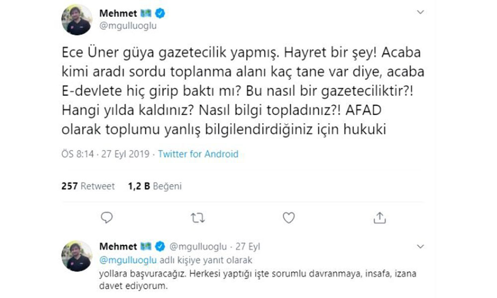 Üner'in canlı yayındaki sözleri üzerine AFAD Başkanı Mehmet Güllüoğlu'ndan açıklama geldi. Twitter hesabından konuyla alakalı paylaşım yapan Güllüoğlu, Ece Üner'e şu sözlerle sitem etti: "Ece Üner güya gazetecilik yapmış. Hayret bir şey! Acaba kimi aradı sordu toplanma alanı kaç tane var diye, acaba E-devlete hiç girip baktı mı? Bu nasıl bir gazeteciliktir?! Hangi yılda kaldınız? Nasıl bilgi topladınız?! AFAD olarak toplumu yanlış bilgilendirdiğiniz için hukuki yollara başvuracağız. Herkesi yaptığı işte sorumlu davranmaya, insafa, izana davet ediyorum."