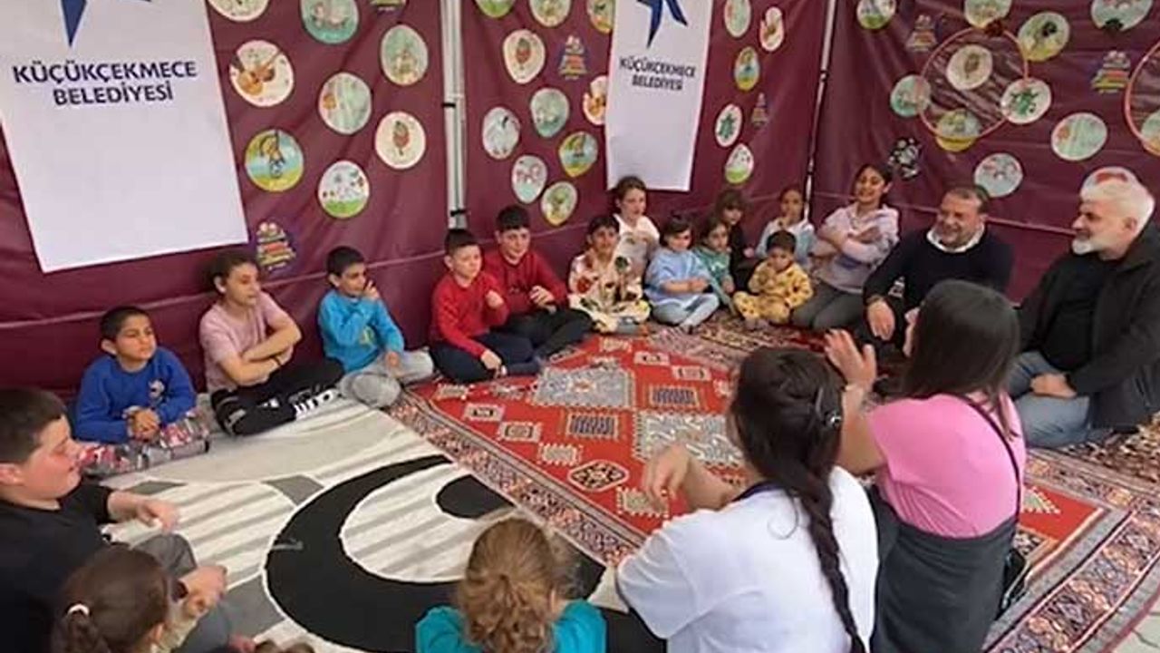 Yazar Nebil Özgentürk ve Küçükçekmece Belediyesi Kültür ve Sosyal İşler Müdürü Güney Özkılınç Hatay'da depremden etkilenen çocuklarla 'Oyun Sokağı'nda buluştu.