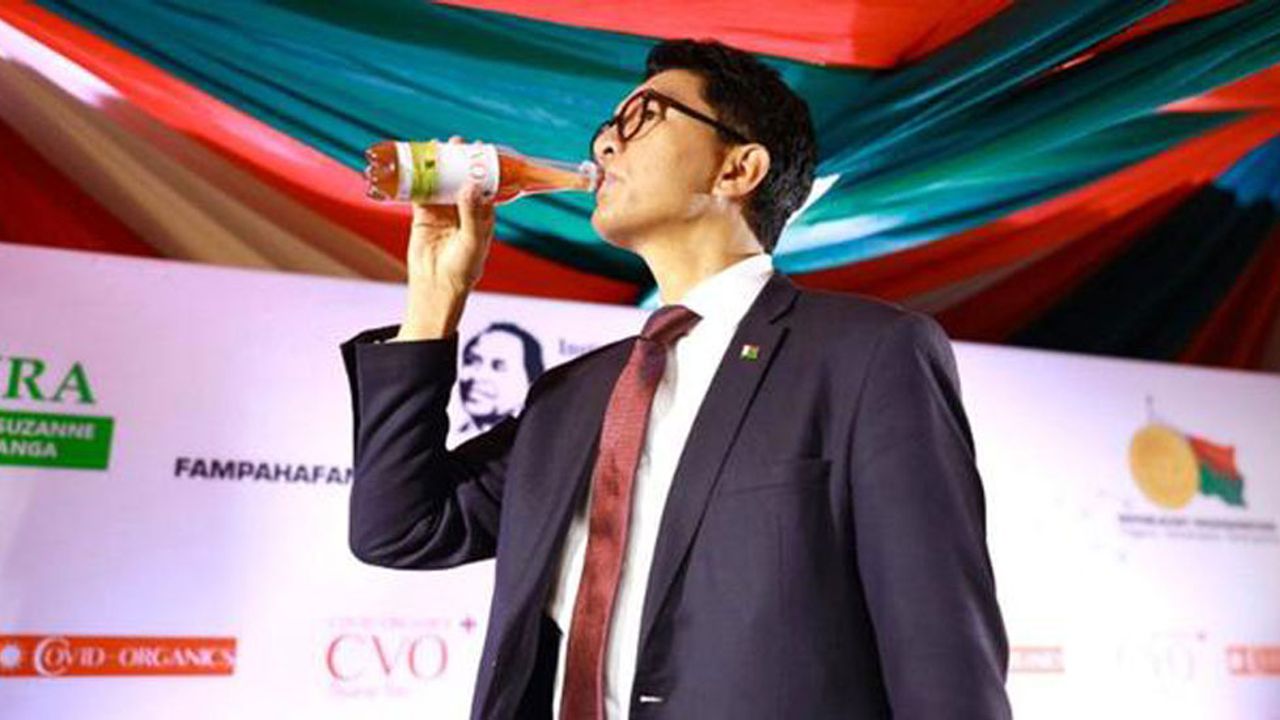 Rajoelina, Madagaskar Uygulamalı Araştırma Enstitüsü'nün geliştirdiği ve sıtma tedavisinde kullanılmasıyla bilinen artemisia bitkisi ve ülkedeki birçok "şifalı otun" karışımından oluşan "Covid Organics" adını verdikleri ilacın tanıtımını yaptı. Bitkisel çayın yedi gün içinde sonuç verdiğini belirten Rajolina, "Bugün bu ilacın iyileştirdiğini, ve öldürmediğini göstermek için önünüzde deneyeceğim" diyerek ilacı içti.