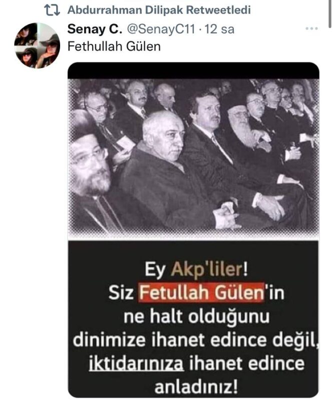İktidara yakınlığıyla bilinen Yeni Akit yazarı Abdurrahman Dilipak, Twitter hesabından dikkat çeken bir paylaşımda bulundu. Dilipak, AKP'li Cumhurbaşkanı Recep Tayyip Erdoğan ile FETÖ elebaşı Fethullah Gülen'in fotoğrafının bulunduğu bir paylaşımı RT yaptı (alıntıladı). O paylaşım şöyle: