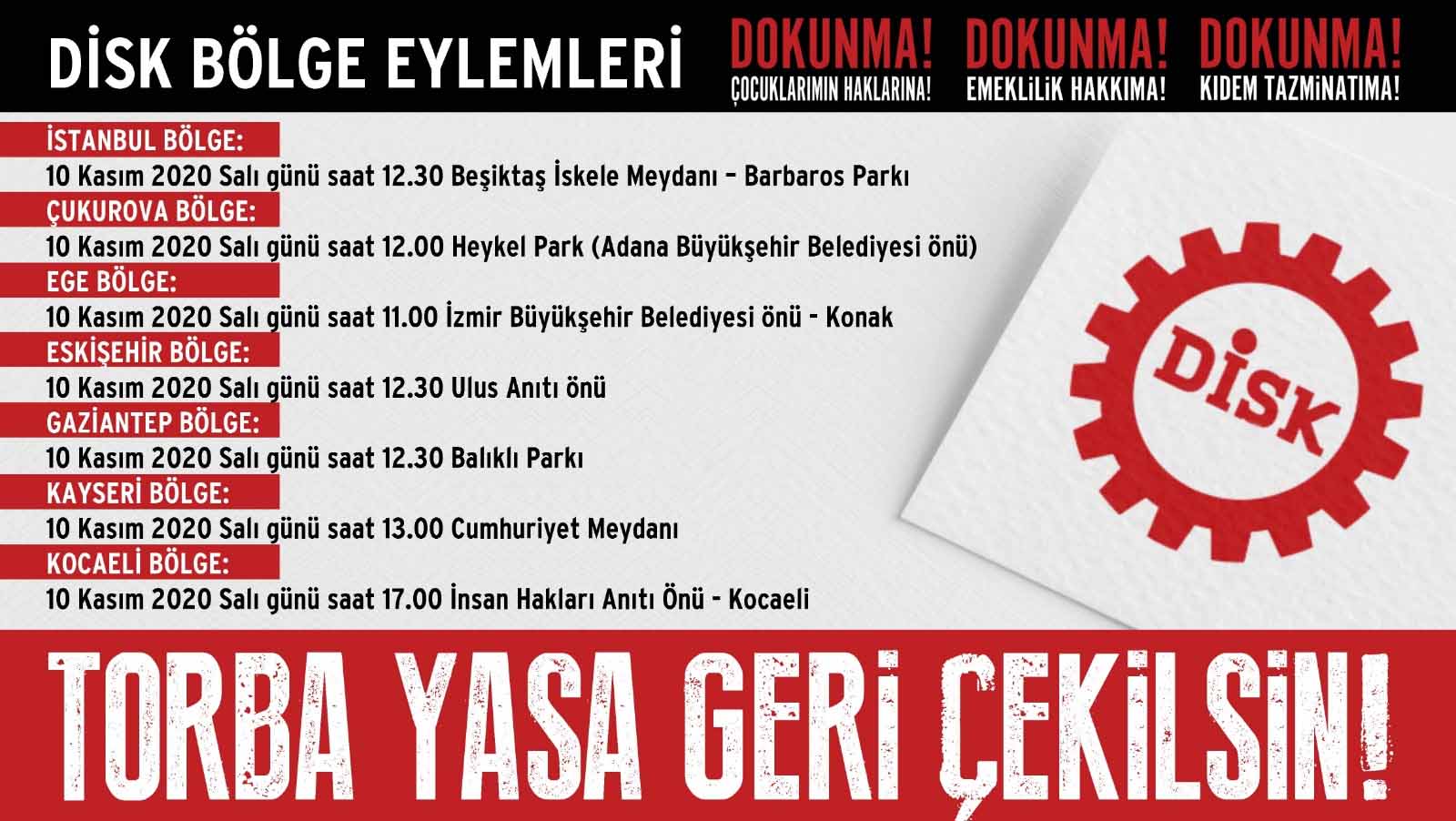 Daha önce kıdem hakkının gasp edilmesine karşı meclis önünde basın açıklaması yapan DİSK, sokak çağrısı yaptı. Saat 12.30'da Beşiktaş Babaros Parkı'nda bir araya gelecek olan DİSK üyeleri "Torba yasaya hayır" diyecek. DİSK Genel Sekreteri Arzu Çekezoğlunun Twitter'dan yaptığı açıklama şöyle: Kıdem tazminatımıza sahip çıkmak için bugün saat 12.30'da Beşiktaş'ta buluşuyoruz! #TorbaYasayaHayır Beşiktaş Barbaros Parkı 10 Kasım 2020 Salı 12:30 https://twitter.com/arzucerkezoglu/status/1326033471333146624?s=28 DİSK'ten yapılan açıklamaya göre diğer illerde yapılacak eylemlerin yeri ve saati şöyle:
