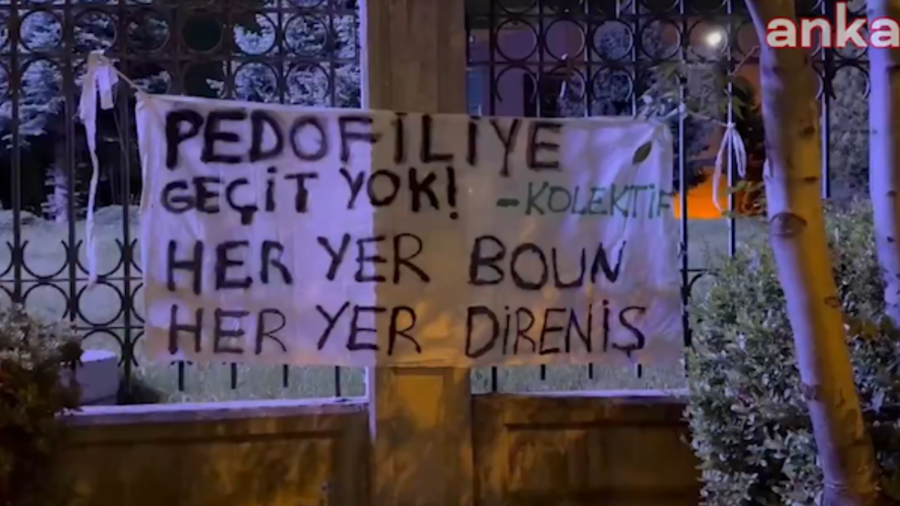 Gözaltılara tepki gösteren Ankara'da bir grup öğrenci Diyanet İşleri Başkanlığı'na "Pedofiliye Geçit Yok! Her yer BOÜN, her yer direniş" yazılı pankart astı.