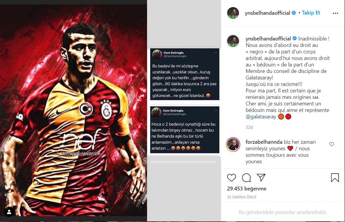 Galatasaray'ın orta saha oyuncusu Younès Belhanda, sosyal medyada kendisi hakkında "Bu bedevi ile sözleşme mi uzatılacak?" sözlerine isyan etti. Belhanda, "Yeter artık! Önce 'Negro' şimdi de Bedevi... Bu ırkçılık nereye kadar sürecek? Sayın dostum, evet ben bir bedeviyim ama Galatasaray'ı seven ve temsil eden bir bedeviyim. Kökenlerimi asla inkar etmeyeceğim" dedi. İşte o paylaşım;