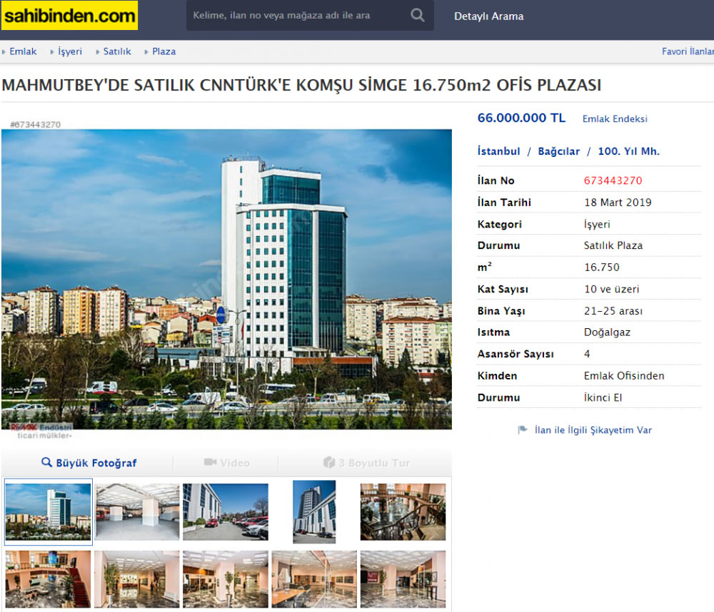 18 Mart tarihinde söz konusu ilanın konulduğu görülürken, 16.750 m2'lik plaza için 66.000.000 TL fiyat biçildiği fark edildi.