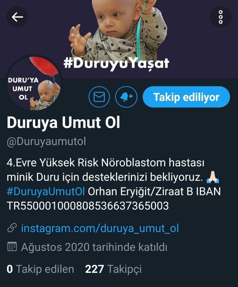 İstanbul'da, 7 aylıkken 4'üncü Evre Yüksek Risk Nöroblastom tanısı konulan Duru Eryiğit'in geçirdiği ameliyat ile karın bölgesinden 15 santimetre büyüklüğünde ve 1 kilogram ağırlığındaki kitle çıkarıldı. Duru, Çapa Tıp Fakültesi Hastanesi'nde başlatılan tedavide 8 kür ağırlaştırılmış kemoterapi ve 21 kür radyoterapi tedavisi gördü. Uzmanlar, küçük Duru'nun sağlığına kavuşabilmesi için AntiGD2 tedavisi (Qarziba-Dinutuximab) görmesi gerektiğini bildirdi. Bunun üzerine harekete geçen ve maddi imkanı olmayan aile, yaşama tutunmaya çalışan çocukları için İstanbul Valiliği'nin onayı ile yardım kampanyası başlattı. Tedavi için, 4 milyon TL gerektiği öğrenilirken, aile başlattığı yardım kampanyası sayesinde yaklaşık 24 saatte 1 milyon 430 bin TL topladı. Minik Duru, yaşama tutunmak için yardımseverlerden destek bekliyor.