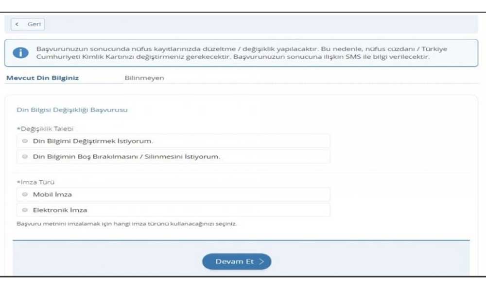 Günün erken saatlerinde yapılan bir değişiklik ile artık vatandaşlar e-Devlet üzerinden inanç bilgilerini değiştirebilecekler. Daha önceleri İl Nüfus Müdürlükleri tarafından yapılan bu işlem, artık online olarak gerçekleştirilebiliyor.