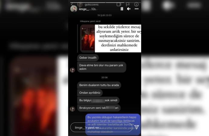 İmge "Bu şekilde yüzlerce mesaj alıyorum. Bir şey söylemediğim sürece de susmayacaksınız sanırım. Derdinizi mahkemede anlatırsınız" notunu düşerek kendisine hakaret eden kişinin mesajını takipçileri ile paylaştı.