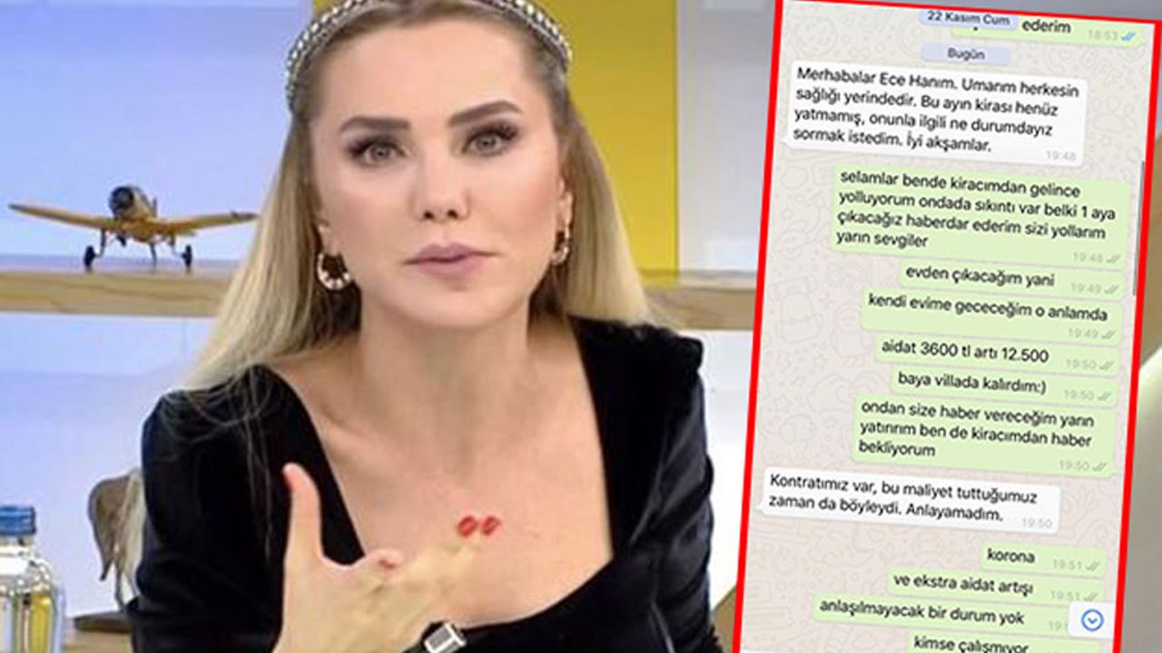 Sunucu Ece Erken, kirayı isteyen ev sahibiyle yaptığı konuşmayı sosyal medya hesabından paylaşarak "Aidat 3600 TL artı kira 12.500 TL, bu paraya villada kalırdım. Sonuçta korona var, kimse çalışmıyor" dedi.