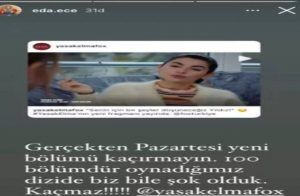 İzleyiciye yeni bölümü kaçırmaması önerisinde bulunan Eda Ece, "100 bölümdür oynadığımız dizide biz bile şok olduk. Kaçmaz!" ifadelerini kullandı.