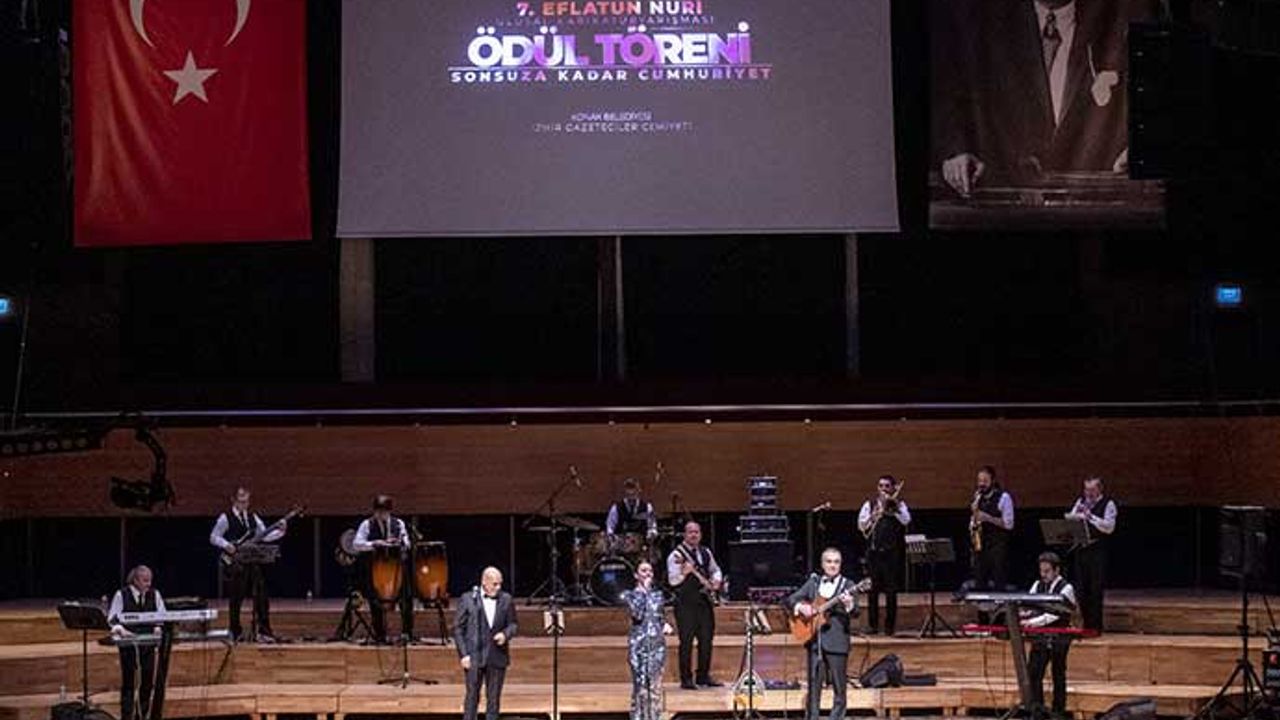Konak Belediyesi ve İzmir Gazeteciler Cemiyeti’nin (İGC), bu yıl 7’ncisini düzenlediği Eflatun Nuri Ulusal Karikatür Yarışması Ödül Töreni, Ahmet Adnan Saygun Sanat Merkezi’nde (AASSM) gerçekleşti. Bu yılki teması “Sonsuza Kadar Cumhuriyet” olan yarışmanın, gelenek olduğu üzere 10 Ocak Çalışan Gazeteciler Günü’nde gerçekleştirilen ödül törenine Konak Belediye Başkanı Abdül Batur’la birlikte İzmir Gazeteciler Cemiyeti Başkanı Dilek Gappi ve yönetim kurulu üyeleri, CHP İzmir İl yönetim kurulu üyeleri, CHP Konak İlçe Başkanı Ozan Ali İlgazi ve yönetim kurulu üyeleri, İzmir Kent Konseyi Başkanı Nilay Kökkılınç, İGC önceki dönem Başkanı Misket Dikmen, Konak Belediyesi Meclis Üyeleri, İzmir İl Kültür ve Turizm Müdürlüğü temsilcileri, Eflatun Nuri’nin ailesi, adına portre özel ödülü düzenlenen Mustafa Bora’nın ailesi, demokratik kitle örgütleri, sivil toplum kuruluşları ile sendikaların başkan ve temsilcileri, kadın dernekleri başkan ve temsilcileri, muhtarlar ve karikatür sanatçıları başta olmak üzere İzmir sanat çevresi katıldı. Açılış konuşmalarıyla başlayan ödül töreninde, ödüller sahiplerini bulurken Aegean Band de muhteşem bir konserle ödül gecesini unutulmaz kıldı.