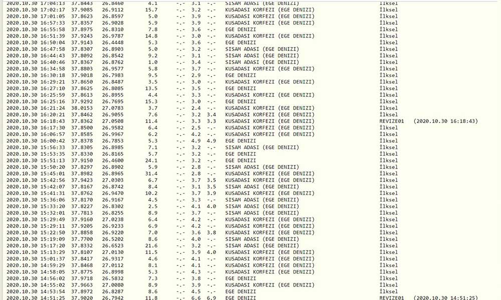 İzmir'de saat 14.51'de meydana gelen 6.9 büyüklüğündeki depremin ardından büyüklüğü 4’ün üzerinde 24 olmak üzere, toplam 244 artçı deprem meydana geldi. Kandilli tarafından yayınlanan deprem listesi ise şöyle: