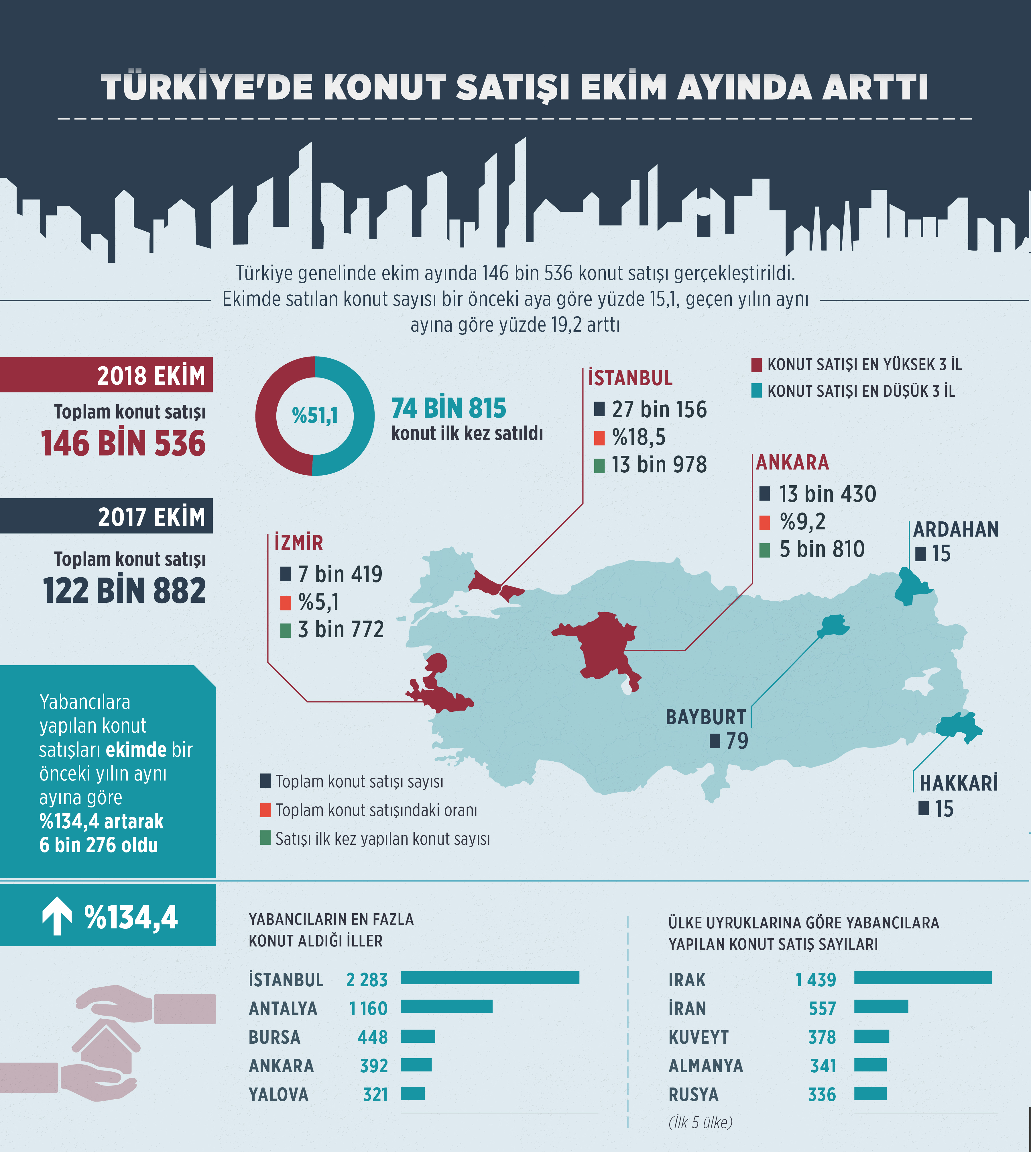 Konut satışlarında İstanbul 27 bin 156 konutla ilk sırada (yüzde 18,5) yer aldı. İstanbul'u 13 bin 430 konut satışıyla (yüzde 9,2) Ankara, 7 bin 419 konut satışıyla (yüzde 5,1) İzmir izledi. En az satış olan iller 15 konutla Hakkari ve Ardahan, 79 konutla da Bayburt olarak kayıtlara geçti.