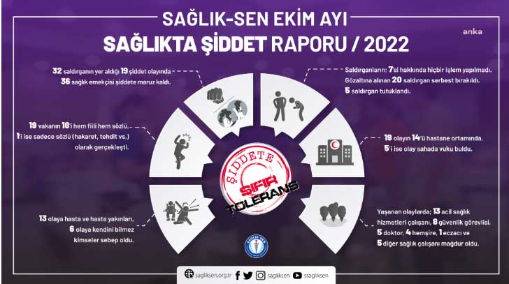 Sağlık-Sen'in ekim ayına ilişkin sağlıkta şiddet raporuna göre, 32 saldırganın neden olduğu 19 şiddet vakasında 36 sağlık çalışanının mağdur oldu. Ay boyunca yaşanan 19 şiddet olayının 13’üne hasta ve hasta yakınları neden oldu.