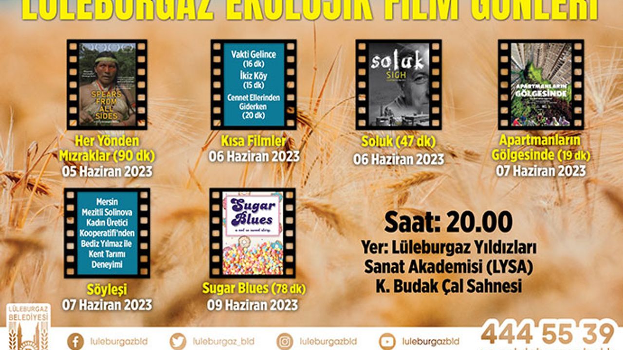 Lüleburgaz Belediyesi, dünyada her geçen gün artan çevre sorunlarına dikkat çekmek ve çevreye karşı farkındalık oluşturmak amacıyla Ekolojik Film Günleri düzenleyecek. TEMA Lüleburgaz İlçe Sorumluluğu, Lüleburgaz Sinema Topluluğu, BIFED ve Film Kooperatifi iş birliğiyle düzenlenecek film gösterimleri 5, 6, 7 ve 9 Haziran tarihlerinde saat 20.00’dea LYSA Budak Çal Sahnesi’nde izleyiciyle buluşacak.