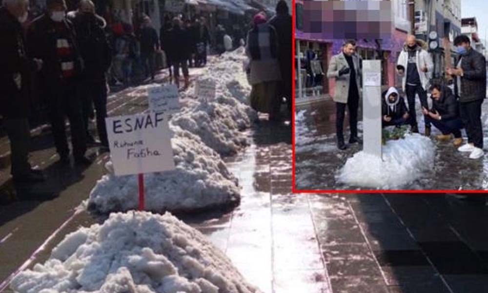 Yolun ortasında mezar yapan esnaflar, koydukları mezar taşına ise "Esnaf öldü" yazısı astı. Kısıtlamalar sebebiyle müşteri sayısı azalan, kira ve faturalarını ödemek için çabalayan esnaflar mezarın üzerine çiçek de yerleştirdi.