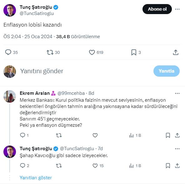 İris Cibre: TCMB 'Kurul, enflasyon beklentileri ve fiyatlama davranışlarında başlayan sınırlı iyileşmenin devam ettiğini değerlendirmektedir' diyerek Ocak ve Şubat'ta gelecek enflasyonu ve beklentilerdeki bozulmayı görmezden gelmiş görünüyor. TCMB: Politika faizinin mevcut seviyesinin aylık enflasyonun ana eğiliminde belirgin bir düşüş sağlanana ve enflasyon beklentileri öngörülen tahmin aralığına yakınsayana kadar sürdürüleceği değerlendirildi. Enflasyon görünümü üzerinde belirgin ve kalıcı riskler oluşması durumunda ise parasal sıkılık gözden geçirilecektir. %45'te kalınacağı anlaşıldı Bu metin yeterince şahin değil. İzin %45'imiş. Hayırlı olsun... TCMB resmen "bu kadar izin aldık" demiş Ocak, Şubat enflasyonu, beklentilerde bozulma, döviz talep artışı, mevduat faizlerindeki düşüş görmezden gelinmiş Durum ne? Yüksek kredi faizi, gevşek mevduat faizi, yüksek kur.... Zaten enflasyon üzerinde belirgin riskler varken, "oluşursa" diyerek, benden bu kadar diyen MB YAZIK... Yapılması gereken şuydu/şu; hadi önden yükleme yapamıyorsun, %45'e izin alabildin ek sıkılaşmanın projeksiyonda olduğuna piyasayı ikna edecek bir metin. Gerçekten ihtiyaç duyulduğu süre bu seviyede kalınacağına garanti baz etkisine güvenerek gevşenmeyeceğine söz mevduat faizlerini yukarı çekecek tedbirler... Brüt rezerv PR'ına da ihtiyaç yok. https://twitter.com/iriscibre/status/1750482436536901679 Tunç Şatıroğlu: Enflasyon lobisi kazandı.