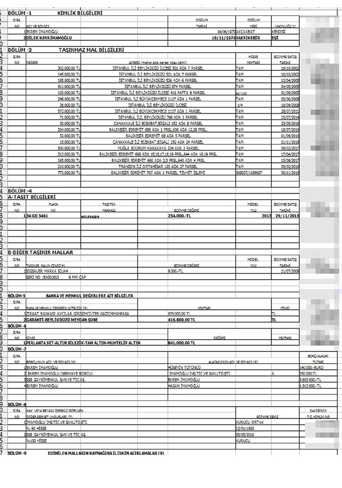 23 Haziran'da yapılan yenileme seçiminde resmi olmayan sonuçlara göre İstanbul Büyükşehir Belediye Başkanı seçilen Ekrem İmamoğlu, mal varlığını açıkladı. Ekrem İmamoğlu'nun İletişim Ofisi'nden yapılan açıklamaya göre, Ekrem İmamoğlu'nun Beylikdüzü'nde tapu değeri 302 bin ve 71 bin lira olan iki dükkanı, 120 bin ve 26 bin liralık iki arsası, 911 bin liralık meskeni, Büyükçekmece'de 248 bin liralık dükkanı, Çanakkale'nin Eceabat ilçesine bağlı Bigalı köyünde 30 bin liralık evi ve 15 bin liralık damı, Balıkesir'in Edremit ilçesinde 256 bin, 313 bin, 165 bin ve 772 bin liralık dört arsası, Trabzon'un Ortahisar ilçesinde 210 bin liralık arsası bulunuyor. Beylikdüzü'nde tapu değeri 145 bin lira olan dükkan, 185 bin liralık arsa, Büyükçekmece'de 572 bin liralık konut ve Muğla'nın Bodrum ilçesinde 500 bin liralık mesken, Dilek İmamoğlu'nun üzerinde kayıtlı görünüyor. Ekrem İmamoğlu'nun 254 bin liralık 2013 model cipi ve 8 bin lira değerinde silahı bulunuyor. Banka hesaplarında ise Ekrem İmamoğlu'nun 979 bin lira, eşi Dilek İmamoğlu'nun 418 bin 869 lira olmak üzere toplam 1 milyon 397 bin 869 lira nakit parası yer alıyor. Mal beyanında Dilek İmamoğlu'nun 841 bin liralık pırlanta set-muhtelif altına sahip olduğu bilgisi verildi. Borç ve alacak bilgilerinin de yer aldığı beyanda, Ekrem İmamoğlu'nun Hüseyin Tütüncü'ye 140 bin avro, İmamoğlu İnşaat Ticaret ve Sanayi Limited Şirketi'ne 250 bin lira, Hasan İmamoğlu'na 1 milyon 913 bin lira borcu, SSB Gayrimenkul Sanayi ve Ticaret AŞ'den 3 milyon 603 bin lira alacağı bulunduğu aktarıldı. Mal beyanında Ekrem İmamoğlu'nun 13 Ocak 1993 kurucu ortağı olduğu "İmamoğlu İnşaat Ticaret ve Sanayi Limited Şirketi"nde yüzde 60 hissesi (4 milyon 200 bin lira sermaye) bulunuyor. İmamoğlu ayrıca 5 Mayıs 2016'da çalışma hayatına başlayan SSB Gayrimenkul Sanayi ve Ticaret AŞ'nin de kurucusu.- Baba İmamoğlu'nun mal varlığı