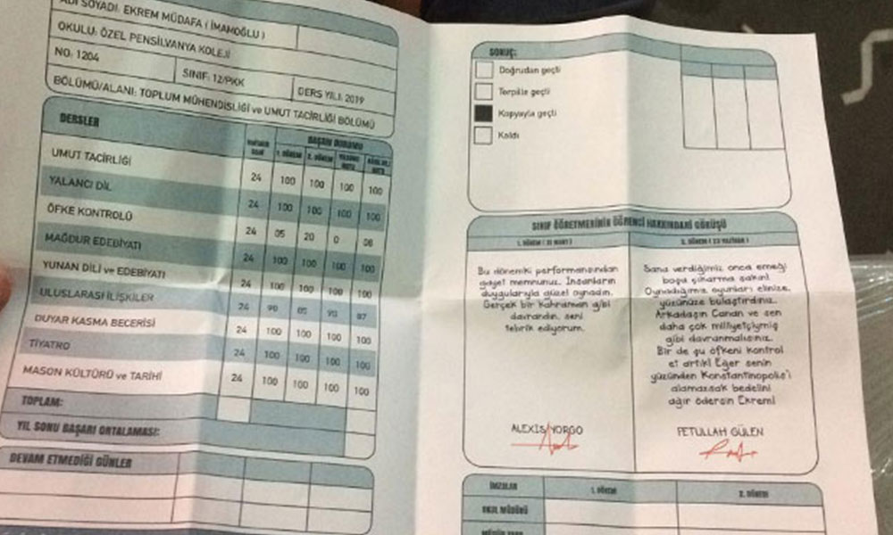 Birgün'den Mustafa Kömüş'ün haberine göre; Karnede “Umut tacirliği, yalancı dil, öfke kontrolü, mağdur edebiyatı, Yunan dili ve edebiyatı, uluslararası ilişkiler, duyar kasma becerisi, tiyatro, mason kültürü ve tarihi” gibi dersler yer aldı. Sınıf öğretmeninin öğrenci hakkındaki görüşü bölümlerine ise 1. dönem Alexis Yorgo ve Fetullah Gülen imzaları atıldı. Alexis Yorgo’nun görüşleri şöyle: “Bu dönemki performansından gayet memnunuz. İnsanların duygularıyla güzel oynadın. Gerçek bir kahraman gibi davrandın. Seni tebrik ediyorum.” Fetullah Gülen’in görüşüne ise şunlar yazıldı: “Sana verdiğimiz onca emeği boşa çıkarma sakın. Oynadığımız oyunları elinize, yüzünüze bulaştırdınız. Arkadaşın Canan ve sen daha çok milliyetçiymiş gibi davranmalısınız. Bir de şu öfkeni kontrol et artık! Eğer senin yüzünden Konstantinopolis’i alamazsak bedelini ağır ödersin Ekrem!” Öte yandan karnelerin 153 İBB Beyaz Masa arabalarıyla alındığı öne sürüldü.