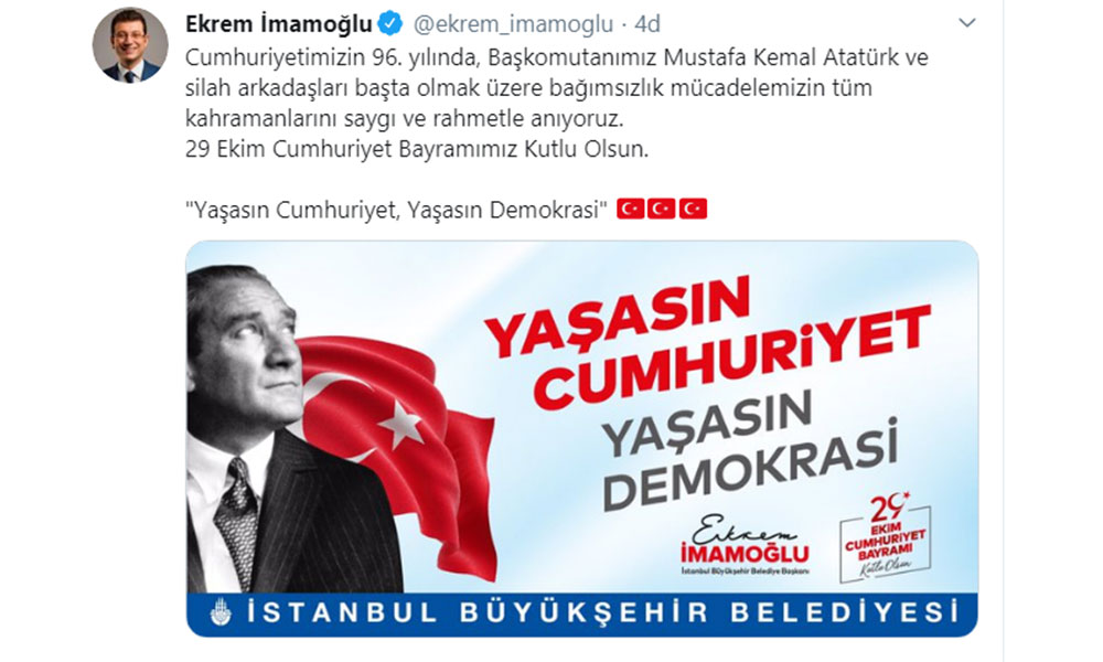 Ekrem İmamoğlu'nun Cumhuriyet Bayramı mesajı şöyle: Cumhuriyetimizin 96. yılında, Başkomutanımız Mustafa Kemal Atatürk ve silah arkadaşları başta olmak üzere bağımsızlık mücadelemizin tüm kahramanlarını saygı ve rahmetle anıyoruz. 29 Ekim Cumhuriyet Bayramımız Kutlu Olsun. "Yaşasın Cumhuriyet, Yaşasın Demokrasi"