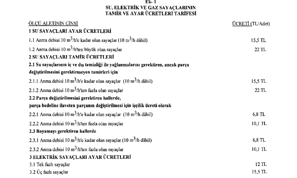 Sanayi ve Teknoloji Bakanlığı'nın Su, Elektrik ve Gaz Sayaçları Tamir ve Ayar Ücret Tarifesi Hakkında Tebliği Resmi Gazete'de yayınlandı. Yeni tarife, eski tarife karşılaştırıldığında tüm kalem ürünlere ortalama yüzde 20 zam yapılmış durumda. Daha önce gaz sayaçları tamir ücretleri 14.5 TL ile 431 TL arasında değişirken bu oran yeni tarife ile 17.3 TL ile 517.2 TL olarak belirlendi. Boyama gerektiren hallerde her bir sayaç için boyama ücreti olarak 2018 yılında 11 TL ile 95 TL arasında bir ücret alınırken bu rakam yeni tarifede 13 TL ile 115 TL olarak belirlendi. Yeni yılda geçerli olacak su, elektrik ve doğal gaz sayaçlarının tamir ve ayar ücretler şu şekilde: