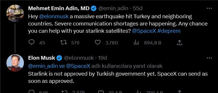 SpaceX ve Tesla'nın CEO'su Elon Musk, Kahramanmaraş merkezli 7.7'lik depremin ardından internet sağlayıcı uydularının Türkiye'de aktif edilebilmesi için Türk hükümetinin onayı gerektiğini söyledi.