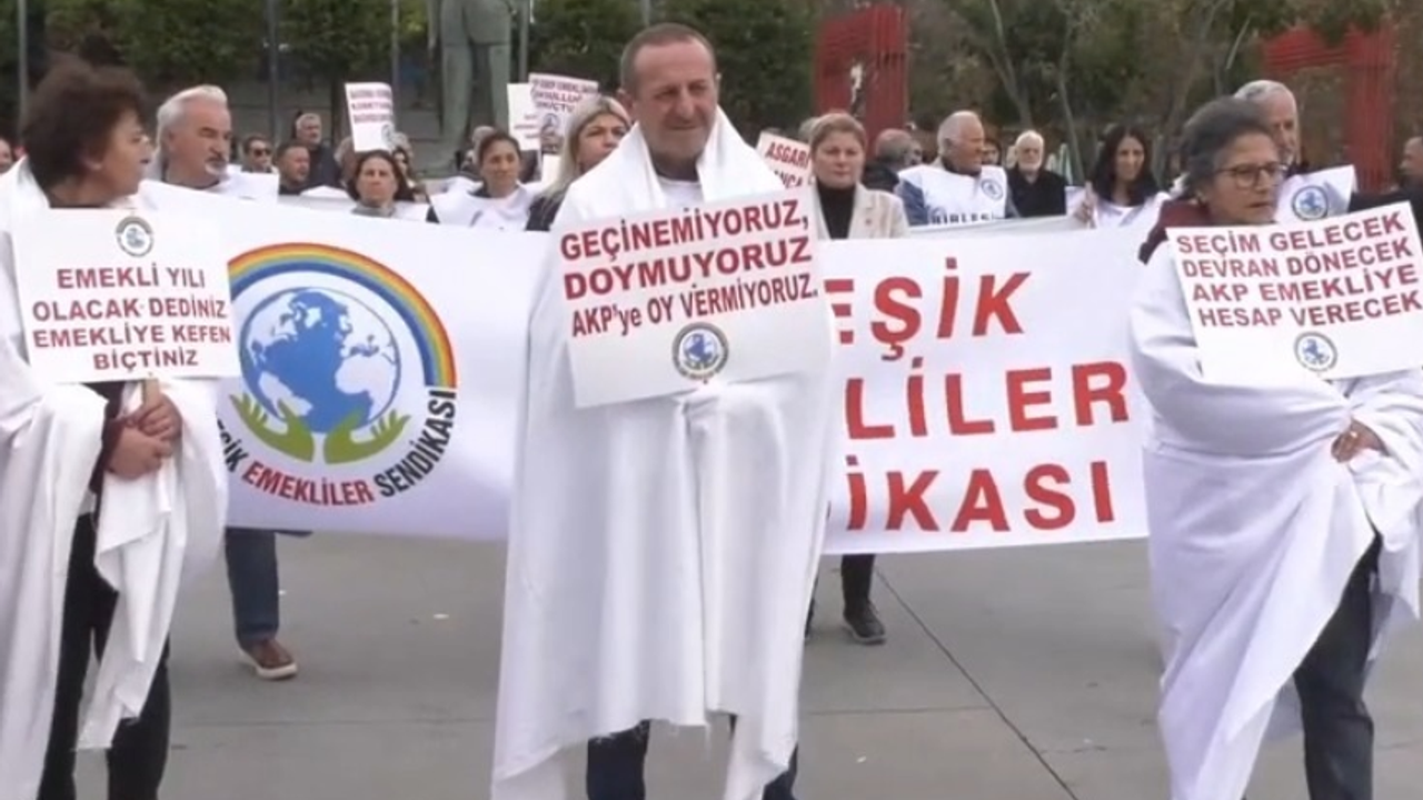 Kefen giyip "Asgari değil insanca yaşam ücreti", "Seçim gelecek, devran dönecek, AKP emekliye hesap verecek", "Geçinemiyoruz, doymuyoruz, AKP'ye oy vermiyoruz", "AKP sebep, emeklinin yoksulluğu sonuçtur", "Emekli yılı olacak dediniz emekliye kefen biçtiniz" yazılı dövizler taşıyan emekliler iktidara kırmızı kart gösterdi. Emekliler adına ortak açıklamayı Birleşik Emekliler Sendikası Genel Sekreteri Aysel Lüle okudu.