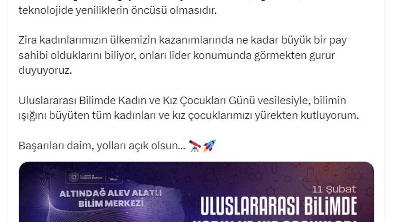 Emine Erdoğan, sanal medya hesabından yaptığı paylaşımda, 'Bir kız çocuğunun gözlerinde parlayan merak, geleceğin en büyük keşiflerine açılan kapıdır. Onların bilime olan ilgisini desteklemek, hayallerinin önündeki engelleri kaldırmak hepimizin görevi. Dünden bugüne tek gayemiz, kız çocuklarımızın, eğitimde, bilimde ve teknolojide yeniliklerin öncüsü olmasıdır. Zira kadınlarımızın ülkemizin kazanımlarında ne kadar büyük bir pay sahibi olduklarını biliyor, onları lider konumunda görmekten gurur duyuyoruz. Uluslararası Bilimde Kadın ve Kız Çocukları Günü vesilesiyle, bilimin ışığını büyüten tüm kadınları ve kız çocuklarımızı yürekten kutluyorum. Başarıları daim, yolları açık olsun' ifadelerini kullandı. (DHA)