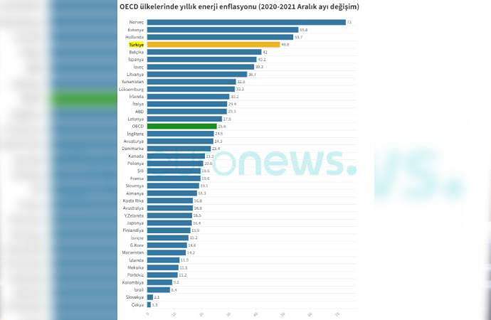 Enerji enflasyonunun en düşük olduğu ülkeler ise yüzde 1,3 ile Çekya ve yüzde 2,1 ile Slovakya. OECD ortalaması ise yüzde 26. Diğer bazı ülkelerde Aralık 2021 itibariyle son bir yıllık enerji enflasyonu şöyle: İspanya ve İsveç yüzde 40, Yunanistan yüzde 33, ABD yüzde 29, İngiltere yüzde 25, Fransa yüzde 20, Almanya yüzde 18 ve İsrail yüzde 8. Türkiye’de elektrik ve doğal gaza yapılan yüksek zamlar bu enflasyon oranlarına henüz yansımış değil. Türkiye’nin enerji enflasyonunda önümüzdeki aylarda daha da yukarı sıralara çıkması bekleniyor.