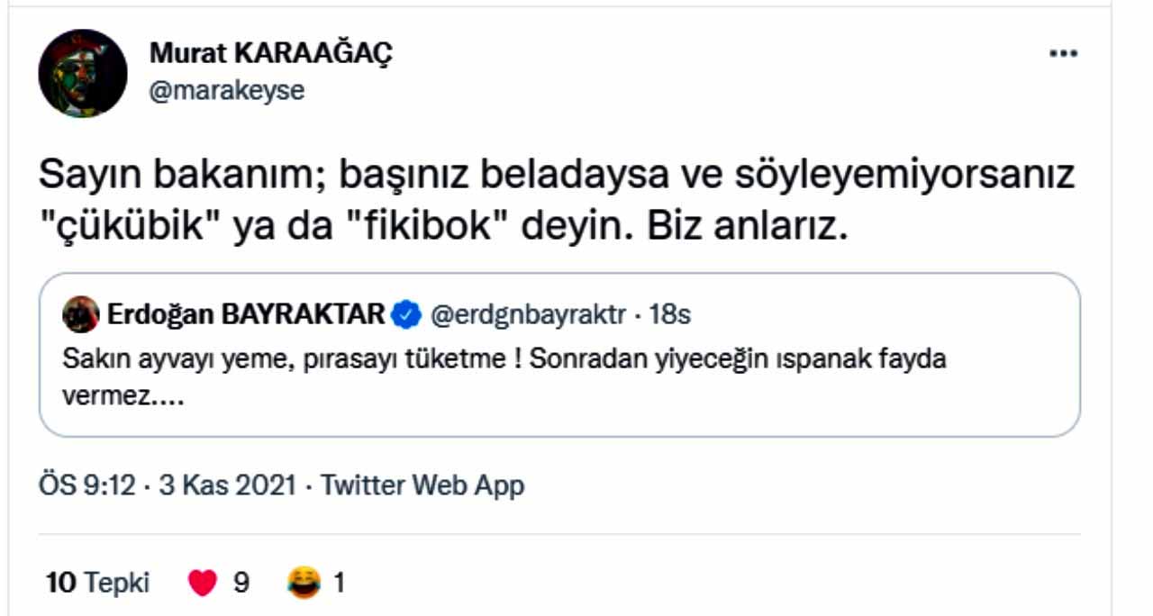 Yaktın yandırdın beni, çapkın aldattın beni” paylaşımı ile verdiği mesajı tartışılan Bayraktar yine anlaşılamayan bir tweetiyle sosyal medyada çok konuşulanlar arasına girdi. Bayraktar, sosyal medya hesabından "Sakın ayvayı yeme, pırasayı tüketme ! Sonradan yiyeceğin ıspanak fayda vermez...." ifadelerini paylaştı. Bazı kullanıcılar Bayraktar'ın yazdıkalrına anlam veremezken bazıları da yeni itiraflarda bulunacağını ifade etti