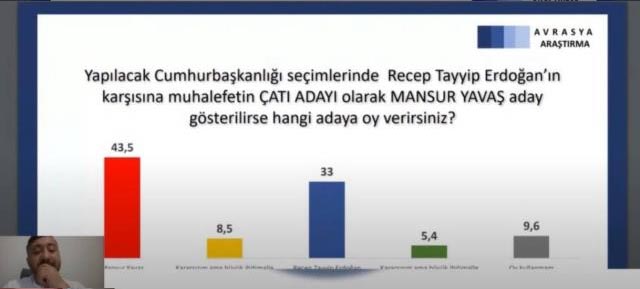 Avrasya Kamuoyu Araştırmaları Başkanı Kemal Özkiraz, son seçim anketini açıkladı. 27 Nisan-3 Mayıs arasında 2 bin 460 kişi ile ve yüz yüze mülakat yöntemiyle yapılan araştırmada, AKP'li Cumhurbaşkanı Tayyip Erdoğan'ın Kemal Kılıçdaroğlu, Ekrem İmamoğlu ve Mansur Yavaş'ın aday olduğu üç senaryoda da yenilgiye uğrayacağı sonucuna varıldı.