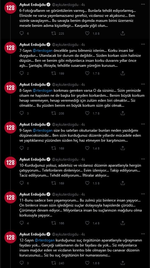 İşlediğiniz suçların milyonlarca mağduru var diyen Erdoğdu ayrıca," Benim tek muradım bir gün sizin yargılanabileceğiniz tek suç olan Vatana İhanet suçuyla yargılanmanız… Bu sayede bir daha kimse bu suçları işlemeye kalkışmasın" ifadelerini kullandı. Aykut Erdoğdu'nun Twitter hesabından yaptığı açıklamalar şu şekilde; "Öncelikle bu kriz ve salgın günlerinde biraz sonra yazacaklarımı sakin, mantıklı ve kararlı bir şekilde yazıyorum… Bu yazdıklarımın doğrudan ilk muhatabı Recep Tayyip Erdoğan ‘dır…Diğer siyasi yöneticiler cürümleri kadar üzerlerine alınsınlar… Bakanlarınız, üst düzey kamu yöneticilerinizden, yargıçlardan ve komutanlardan devletin emrinden çıkıp suç aparatlarınıza dönüşenler kurduğunuz bu suç örgütünün parçaları… Önce bu suç örgütünüzün yaptıklarını yazacağım… Sonra da size yazacağım… ATV ve Sabah grubundan muhabirleriniz en yakın çevremde olan kadın arkadaşlarımı arayıp benimle bir ilişkileri olup olmadığını soruyorlarmış… Sayın Recep Tayyip Erdoğan kurduğunuz düzeninizin bu alçak sorularına cevap vererek siyasi şantajınıza prim vermeyeceğim… Şunu iyi bilin… Ben özel hayatım dolayısıyla sadece eşime hesap veririm… Benim eşim de bu mücadelenin bedelini bilerek bu mücadeleye girmeme izin verdi… Sizin şantajlarınıza boyun eğeceğimizi sanıyorsanız… Bunu zaman size gösterecek… Telefonla arayıp hakkımda sorular sorduğunuz kadınlar bu toplumun en yürekli, en cesur kadınları… Ailemden sonra en yakın olduğum ve hiçbir karşılık beklemeden benim yüzümden bedel ödeyen ve bu gidişle de bedel ödemeye devam edecek olan bu can yoldaşlarımdan özür dilerim… Fotoğraflarım ve görüntülerim varmış… Bunlarla tehdit ediyorlarmış… Elinizde ne varsa yayınlamazsanız şerefsiz, vicdansız ve alçaksınız… Ben sizinle savaştayım… Bu savaşta benim dışımda masum birini üzerseniz mesele benim adıma kişiselleşir… Kavgada yiğit olun…SİZDEN KORKAN SİZİN HALİNİZE DÜŞSÜN