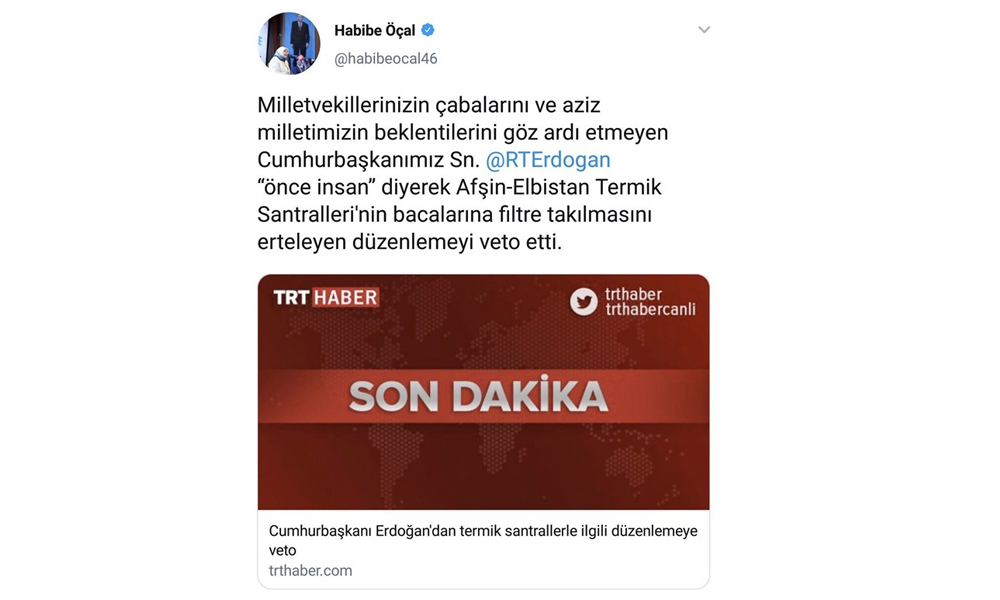 "Milletvekillerimizin çabalarını ve aziz milletimizin beklentilerini gözardı etmeyen Cumhurbaşkanımız Sn. Recep Tayyip Erdoğan, önce insan diyerek Afşin-Elbistan termik santrallerinin bacalarına filtre takılmasını erteleyen düzenlemeyi veto etti."
