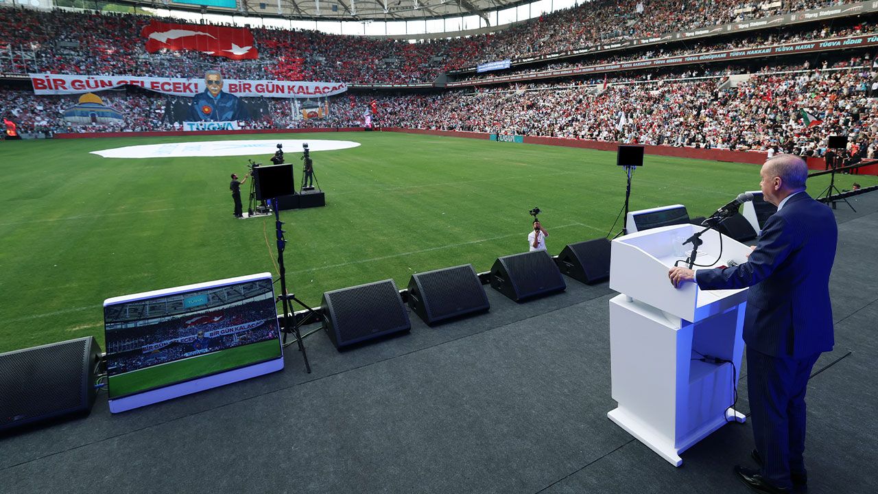 Konuşmasında muhalefeti de eleştiren Erdoğan "Siz hiçbir zaman ümmet olmanın ne demek olduğunu anlamadınız. Bu duyguyu hiçbir zaman yüreğinizde hissetmediniz. Şimdi çıkmış kapkara sicilinize bakmadan bizi eleştiriyorsunuz. Kabine üyelerimizi eleştiriyorsunuz. Bakanlarımıza seviyesizce dil uzatıyorsunuz. Ne yaparsanız yapın, bize kara çalamayacaksınız. Filistin halkının kalbindeki Türkiye sevdasını, Tayyip Erdoğan sevdasını söküp atamayacaksınız" dedi.