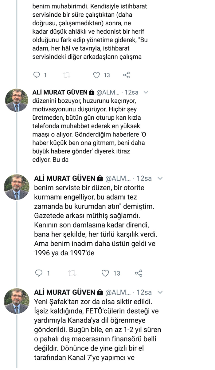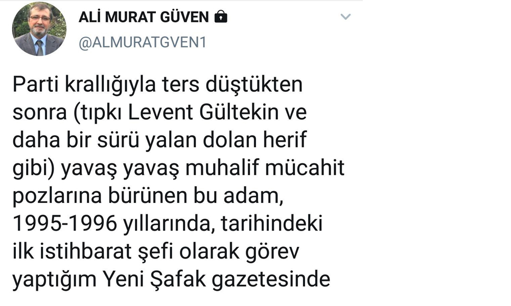 Kemal Öztürk’ün tartışma yaratan açıklamalarına Yeni Şafak’ın eski yazarı Ali Murat Güven’den dikkat çeken bir karşılık geldi. İsim vermeden Öztürk’ü eleştiren Güven, Öztürk’ü “yavaş yavaş muhalif mücahit pozlarına bürünen adam” olarak nitelendirdi. Öztürk’e “hedonist ve düşük ahlaklı” diyen Güven, paylaşımında Öztürk’ün Yeni Şafak’ta çalıştığı dönemde haberleri beğenmediği belirterek, “Hiçbir şey üretmeden, bütün gün oturup karı kızla telefonda muhabbet ederek en yüksek maaşı o alıyor. Gönderdiğim haberlere ‘O haber küçük ben ona gitmem, beni daha büyük habere gönder’ diyerek itiraz ediyor” ifadelerini kullandı. https://tele1.com.tr/kemal-ozturk-isim-aciklamak-cesaret-ister-diyen-ahmet-hakana-kapak-yapti-90dan-cakti-101788/İşte Güven’in o paylaşımları: