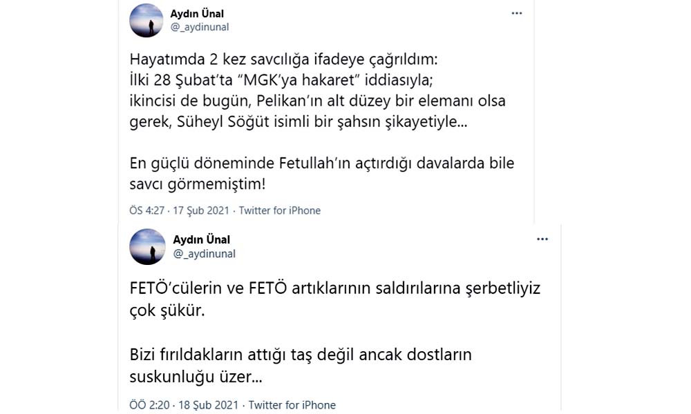 "Hayatımda 2 kez savcılığa ifadeye çağrıldım: İlki 28 Şubat’ta “MGK’ya hakaret” iddiasıyla; ikincisi de bugün, Pelikan’ın alt düzey bir elemanı olsa gerek, Süheyl Söğüt isimli bir şahsın şikayetiyle... En güçlü döneminde Fetullah’ın açtırdığı davalarda bile savcı görmemiştim!