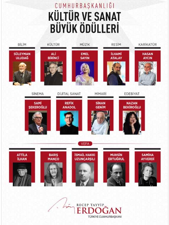 2023 Cumhurbaşkanlığı Kültür ve Sanat Büyük Ödülü sahipleri belli oldu. AKP'li Cumhurbaşkanı Recep Tayyip Erdoğan'ın X hesabından yapılan paylaşımda müzik ödülünün sahibi Emel Sayın, Vefa ödülünün sahibi Atilla İlhan, Barış Manço, İsmail Hakkı Uzun çarşılı, Muhsin Ertuğrul ve Samiha Ayverdi oldu.