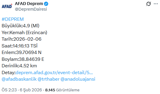 AFAD'ın aktardığı bilgiye göre, Erzincan'ın Kemah ilçesinde saat 14.16'da 4,9 büyüklüğünde deprem meydana geldi.