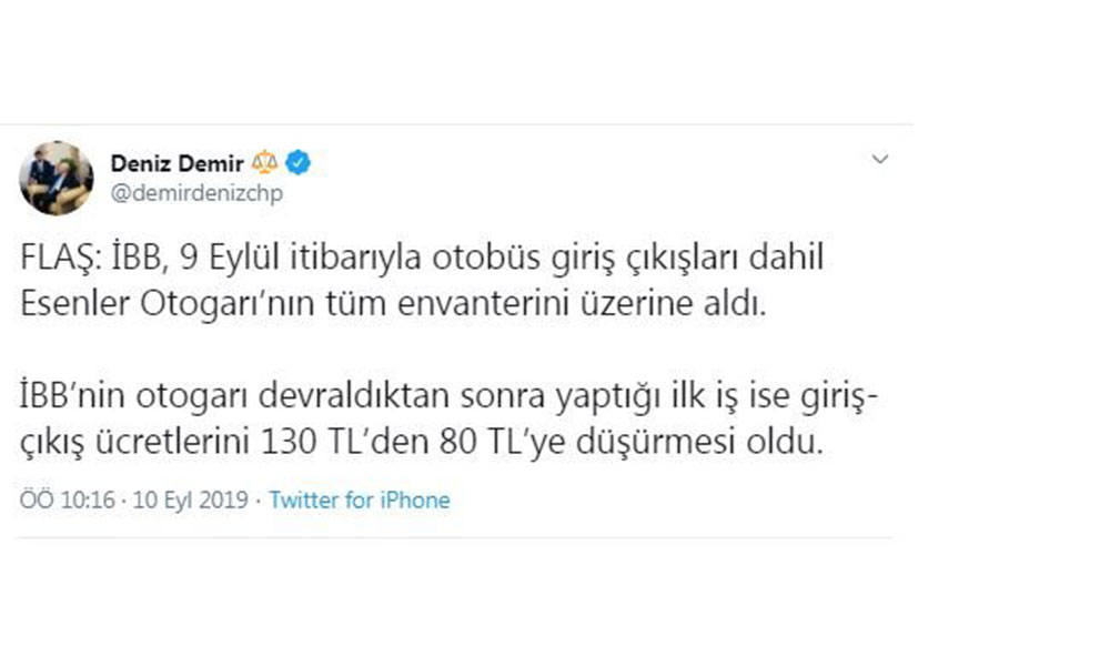 İBB’nin otogarı devraldıktan sonra yaptığı ilk iş ise giriş-çıkış ücretlerini 130 TL’den 80 TL’ye düşürmesi oldu. CHP Genel Başkan Başdanışmanı Twitter'dan yaptığı paylaşımla duyurdu.