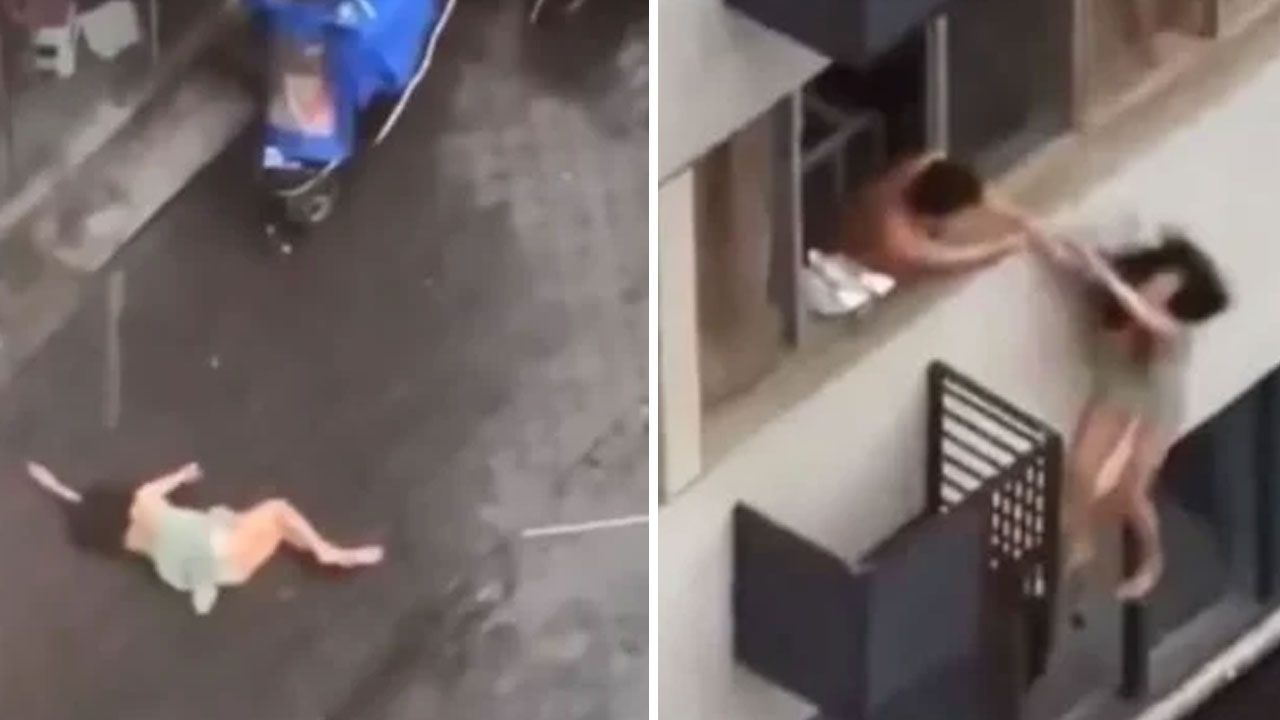 Sinir krizi geçiren kadın, evin balkonuna koşarak kendini aşağı bıraktı. Kadının dördüncü kattan düşme anı, apartman çevresindeki güvenlik kameralarına yansıdı.