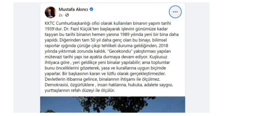 AKP Genel Başkanı ve Cumhurbaşkanı Erdoğan dün KKTC Meclisi'nde yaptığı konuşmada günler öncesinden müjde olarak duyurduğu açıklmayı yapmış, Erdoğan KKTC'ye külliye, parlamento ve millet bahçesi yapılacağını, söz konusu projelerin inşasına yakın zamanda başlanacağını duyurmuştu. https://tele1.com.tr/erdoganin-kktcdeki-kulliye-mujdesine-tepki-yagdi-435728/ Erdoğan'ın külliye müjdesi Kuzey Kıbrıslı siyasetçilerin gündemindeydi.MUSTAFA AKINCI'DAN SERT YANIT