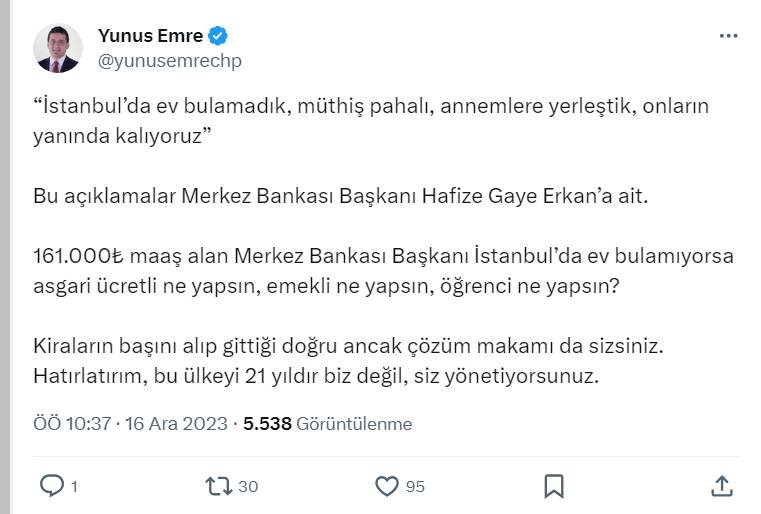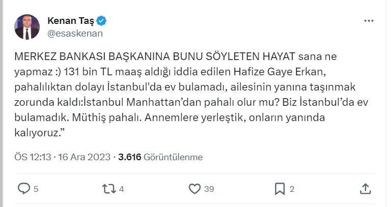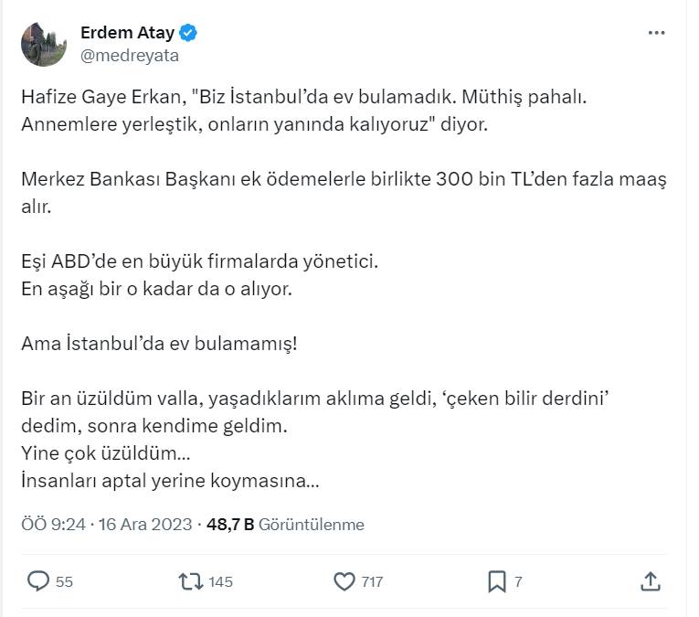 Türkiye Cumhuriyeti Merkez Bankası (TCMB) Başkanı Hafize Gaye Erkan'ın "İstanbul, Manhattan’dan pahalı olur mu? Biz İstanbul’da ev bulamadık. Müthiş pahalı. Annemlere yerleştik, onların yanında kalıyoruz" sözleri sosyal medyada çokça paylaşıldı. Aralarında siyasi ve ünlü isimlerin de dahil olduğu birçok sosyal medya kullanıcısı, Erkan'ın sözlerine tepki gösterdi, sosyal medyada "Yurttaş ne yapsın?" diye soruldu. Demokrat Parti Genel Başkanı Gültekin Uysal X hesabından Erkan'a tepki göstererek "Bu hale kendiliğinden geldi herhalde; @Merkez_Bankasi Başkanı hiç failden bahsetmiyor! İstanbul’u Manhattan’dan pahalı hale getiren kim? 21 yıllık iktidar ve büyük ekonomist Erdoğan!!!" diye yazdı. https://tele1.com.tr/tunc-satiroglu-bu-sistem-patlayacak-cok-saglam-bir-zam-geliyor-971742/ Demokrat Parti Milletvekili Cemal Enginyurt ise "Maliye Bakanı Mehmet Şimşek: "Büyükşehirler de ev kiraları düşüş eğiliminde" Merkez Bankası Başkanı Hafize Gaye Erkan: "İstanbul'da ev bulamadık, müthiş pahalı; annemlere yerleştik, onların yanında kalıyoruz" demiş. Ülke ekonomisi bunlara emanet. Birbirinden habersiz ekonomistler" ifadelerini kullandı. İşte o tepkilerden bazıları: