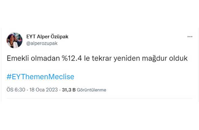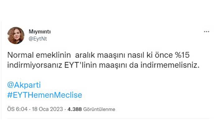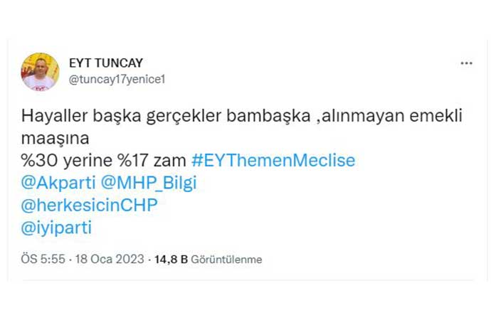 EYT’liler, AKP’li Cumhurbaşkanı Recep Tayyip Erdoğan’ın emekli maaşlarına yüzde 30 zam yapılacağını belirtmesine rağmen girdikleri sistemde maaşlarına ortalama yüzde 15 zam yapıldığını görünce tepki gösterdi.